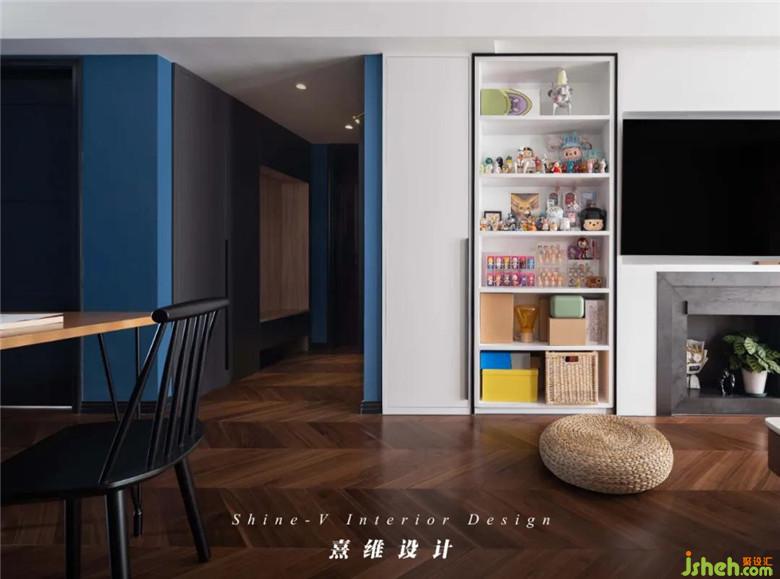▲電視背景墻的這一邊,各式收納空間匯聚在這里,開放式柜體中被塞入數(shù)量繁多的物品,也成了清澈底色上的琳瑯,滿目只見獨(dú)特的活力與清晰,而無冗余。