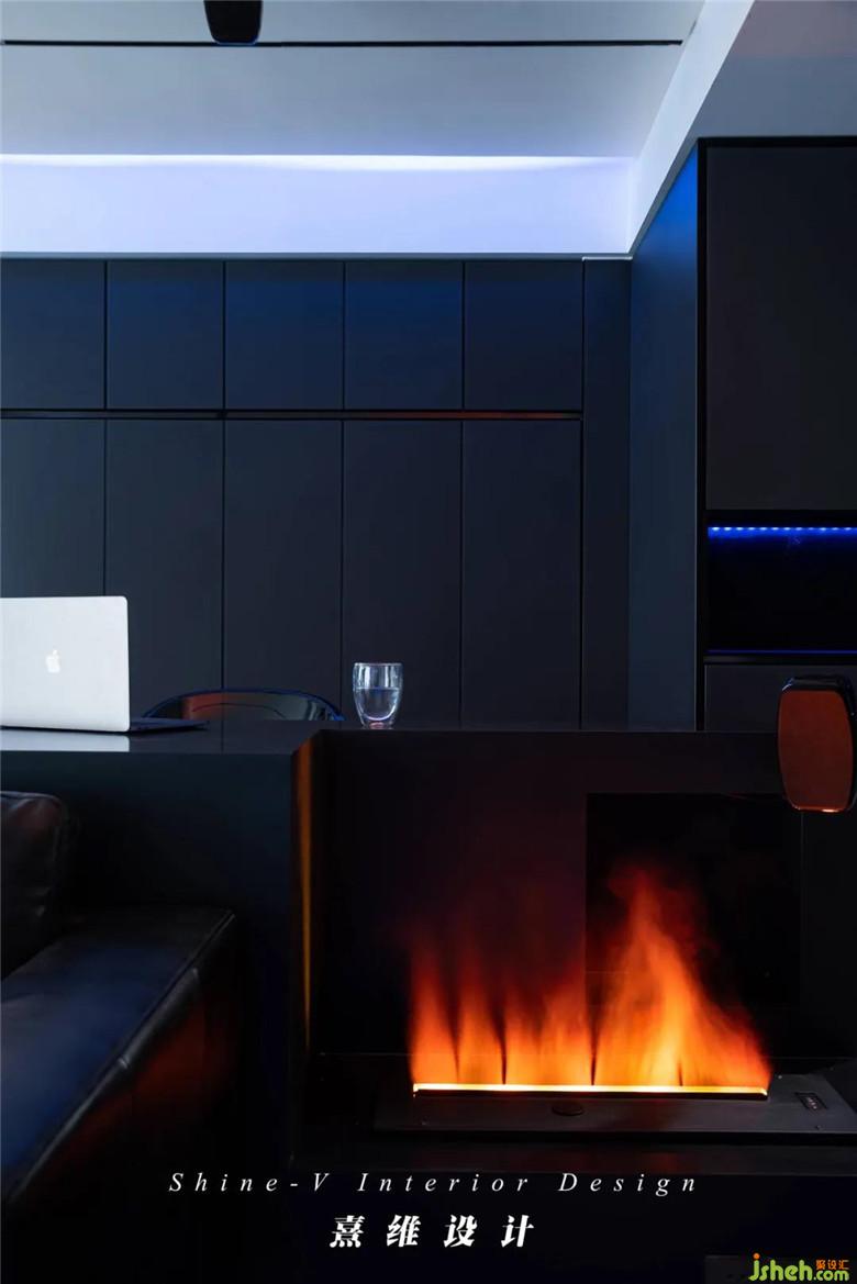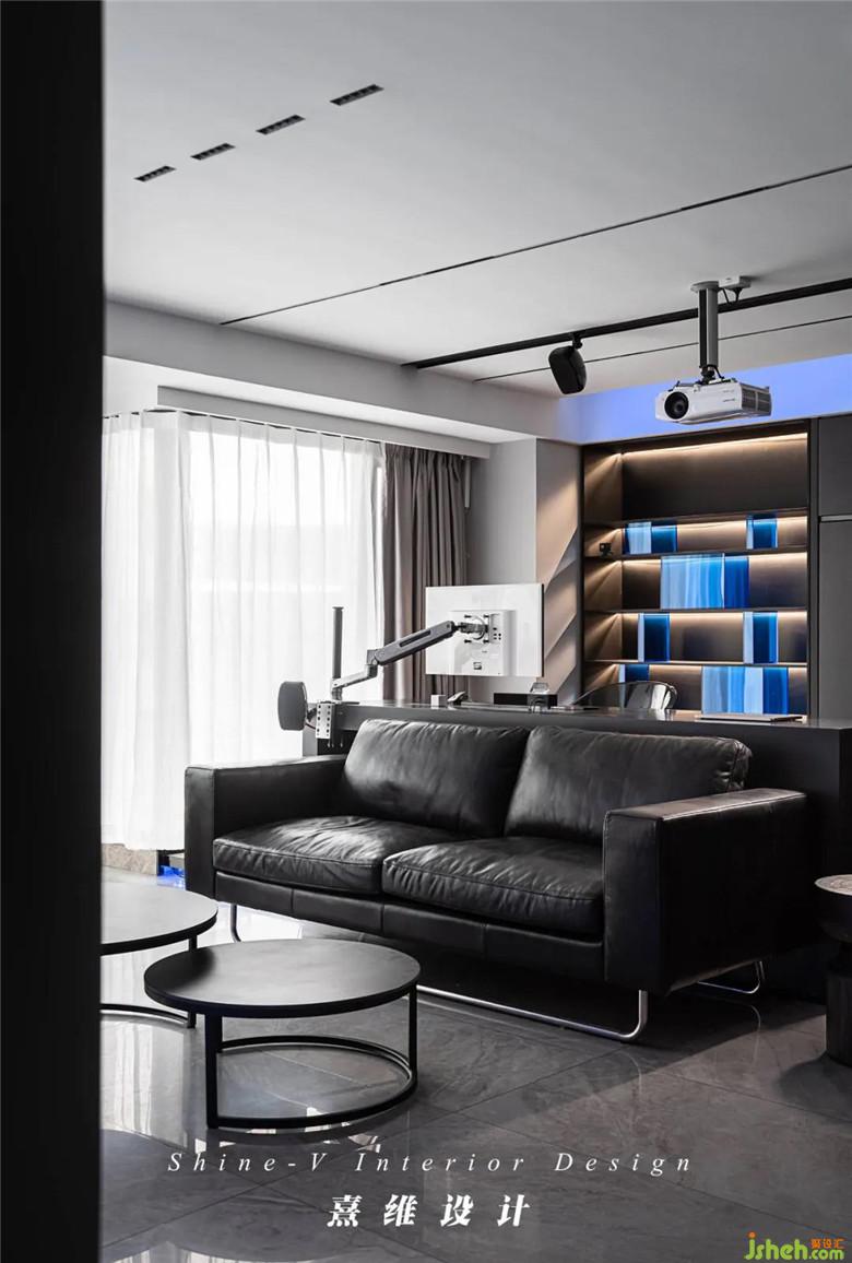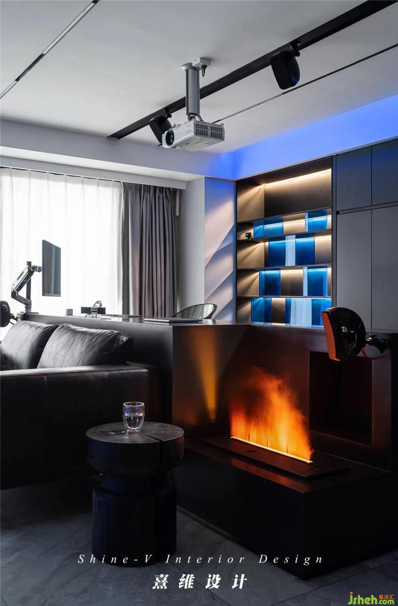 ▲工作區(qū)的柜體,一部分是開放柜,封閉樣式的另一部分其實是下翻床。開放柜內(nèi)裝置上燈帶,擺上定制的亞克力小盒子,光透出來,這些不再是冷冰冰的幾何組合,傳達出一種持續(xù)性的、神秘的迷失感,像引人探索的科幻未來,格外適合家庭中小影院的低暗氛圍。