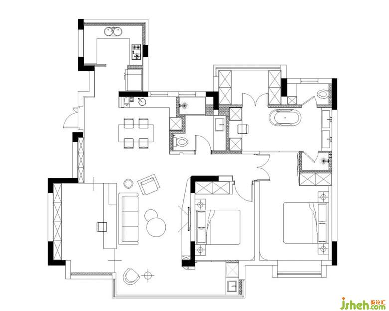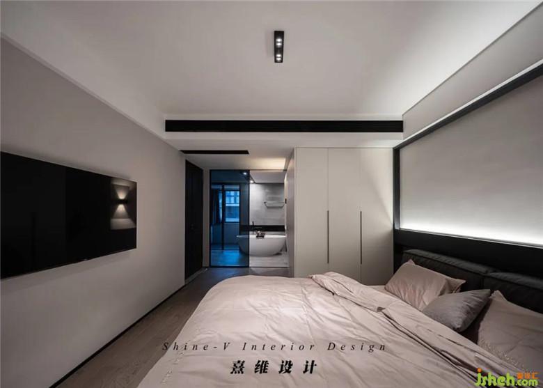 ▲仍以黑白灰著眼與主臥,黑色的色塊與線條勾勒出床頭輪廓,其間被襯托出的灰淺淺的拓展出溫度情感,白色的柜體緊挨黑色的線條,若月下見,輕薄的樣貌呈現(xiàn)出深邃與溫柔。
