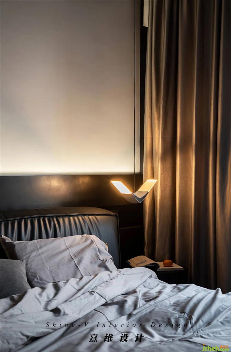 ▲床頭的吊燈是輕盈的V型,像振翅的飛鳥,翅膀耀出暖黃色光,它只照床頭小小一塊地方,陪伴睡前的時(shí)光,在簡單而柔軟的居所里擁有一床清夢。