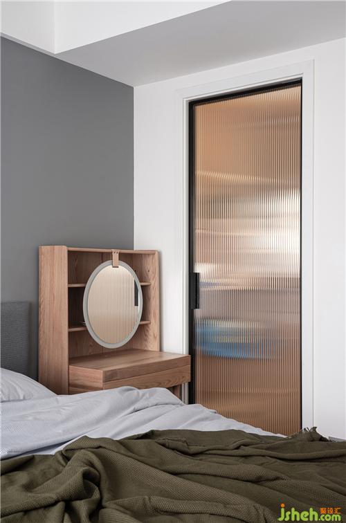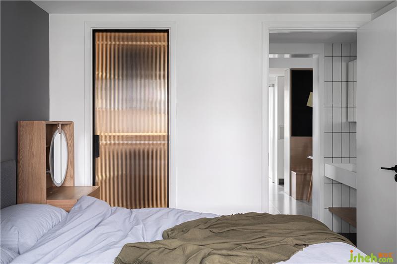 ▲主臥內部劃出很小的衣帽間,小到更像是一個可以步入的衣柜,但容量更多。作為收納的場地,用長虹玻璃使內部的場景朦朧,虛化成功能性的縮影,只留主臥被裁切后仍然規(guī)整的輪廓。