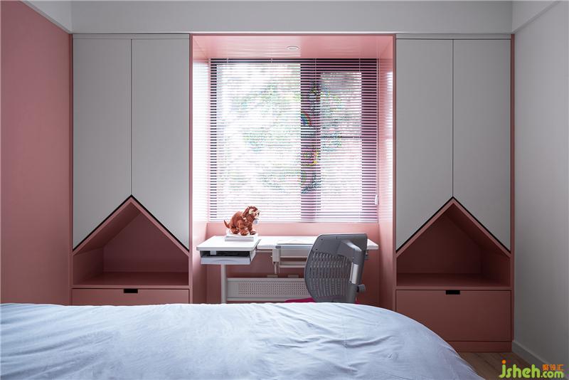 ▲兩個一樣的衣柜屬于兩位小女孩兒,上方掛置衣物、中部開放展示柜、下層抽屜,細化后的功能分區(qū)從小培養(yǎng)出條理性。窗戶被衣柜合圍,書桌擺在窗前,靠近天光,景框設(shè)計描繪孩子學習、娛樂等功能化場景。