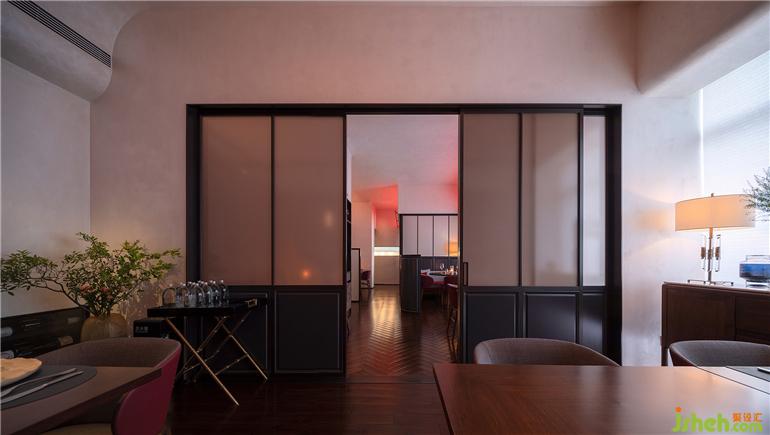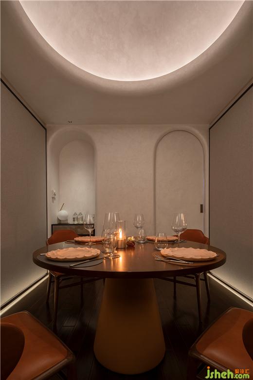 拱券式天花在頭頂扭力交疊,與有機(jī)三曲面定義出雕塑感空間外殼,柔軟的動感在強有力的材料扭結(jié)中滲透出來。餐廳設(shè)計向內(nèi)經(jīng)過旋扭折疊,視野豁然、場景轉(zhuǎn)換,抵達(dá)帶有古典意向和東方觸感的餐區(qū)。多組場景在內(nèi)部拼貼,緊湊卻保持一份疏離感。玻璃幕墻與隔斷移門對空間進(jìn)行蒙太奇式的分隔連接,城市隨機(jī)性與陌生激發(fā)的歸屬感暗含在動線邏輯中??臻g環(huán)游中,無拘束的親切穩(wěn)妥將逐步瓦解對法餐高調(diào)繁復(fù)的刻板印象。