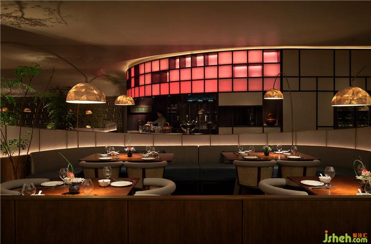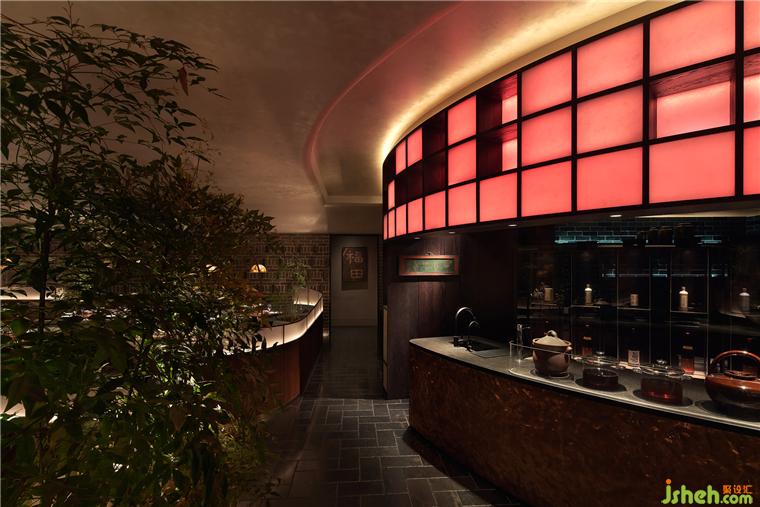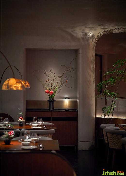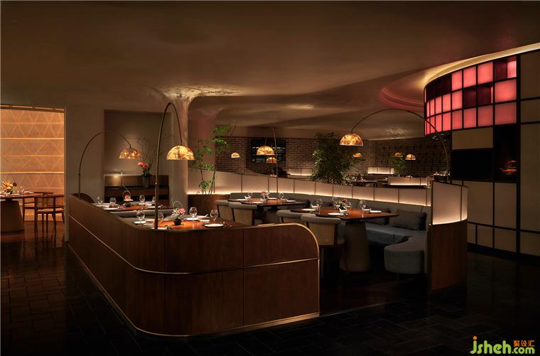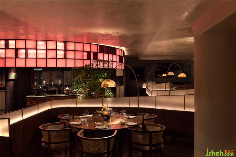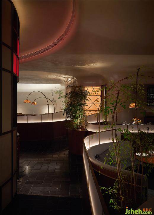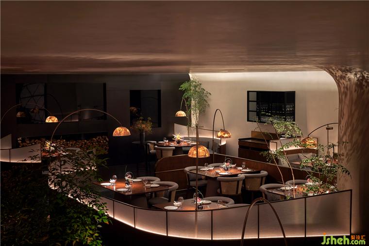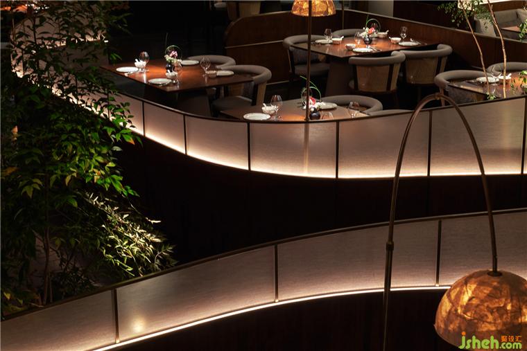 弧形立面和屋面流暢連貫地包覆空間,透光樹(shù)脂板以銅條做骨架,和緩起伏勾出山巒院落,寥寥數(shù)語(yǔ)將微醺低語(yǔ)的客人隔入各自山門(mén)。垂吊燈頭以紙糊面,光線影影綽綽散落,如“月被薄霧所隱”,南麓·薈館設(shè)計(jì)將人們對(duì)燈光、座位、食物的直接直覺(jué)稍微遮蔽了,代之以隱含朦朧的自然意喻,這種覺(jué)知上的留白時(shí)刻等待落座者情緒的涌入。