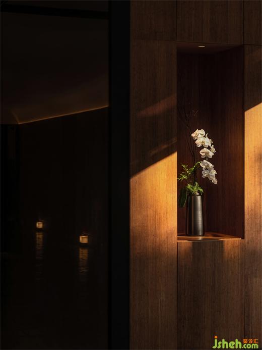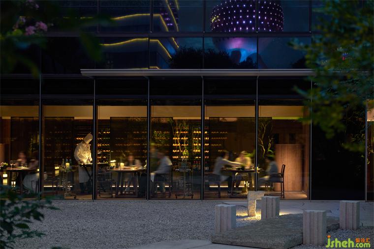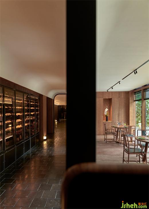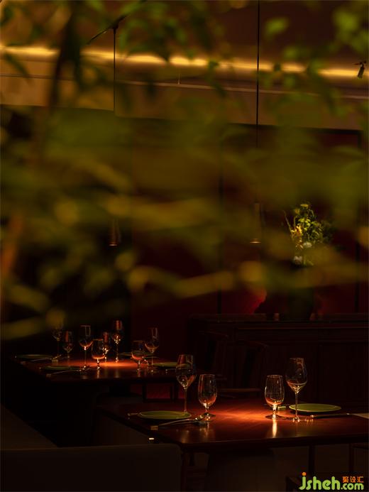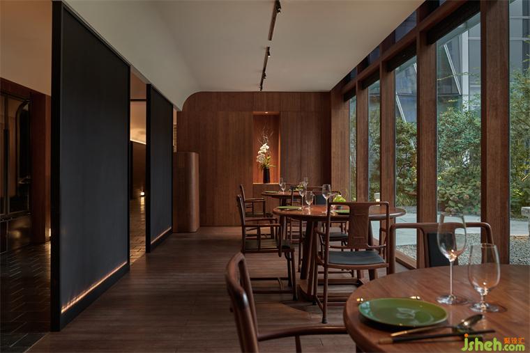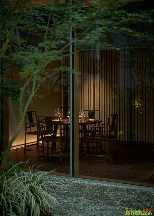 餐廳西側(cè)以四季命名的四間茶室與游廊相連環(huán)抱庭院,內(nèi)外的界限極為模糊,透過(guò)樹(shù)木,再穿過(guò)卷軸般的落地條窗看人影綽綽,東方明珠的炫目霓虹映在玻璃幕墻里,懷抱庭院的內(nèi)部更像是一種帶有煙火的公共美術(shù),并非高深莫測(cè),卻蘊(yùn)含了有人情滋味的生活,又納入了詩(shī)性的寬廣——城市、自然與人在精神性上成為一體,庭院也不再是通常意義上的外部,而是空間內(nèi)部精神的一種顯現(xiàn)。
