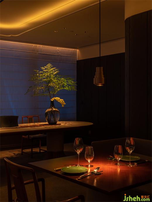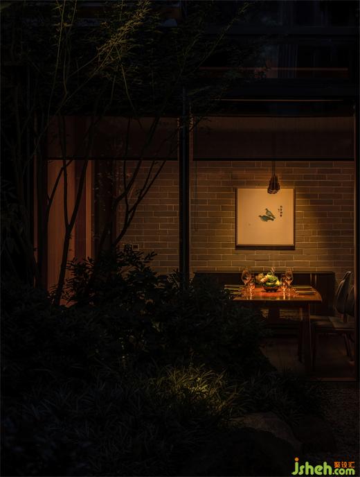 從不同角度看,庭院與餐廳互為內(nèi)外又彼此共融,庭院不過分營造,內(nèi)部不刻意炫技,旗鼓相當(dāng)而激發(fā)出大力道,借勢大江河,餐廳設(shè)計(jì)兼具內(nèi)斂與疏闊。