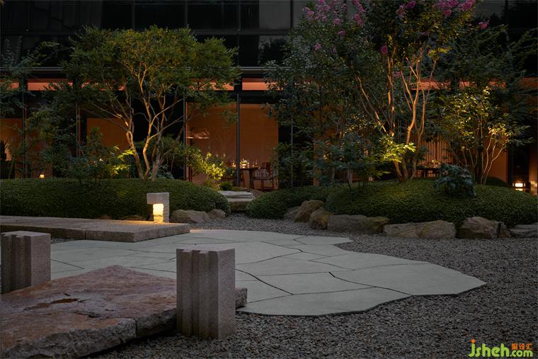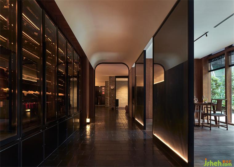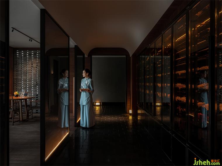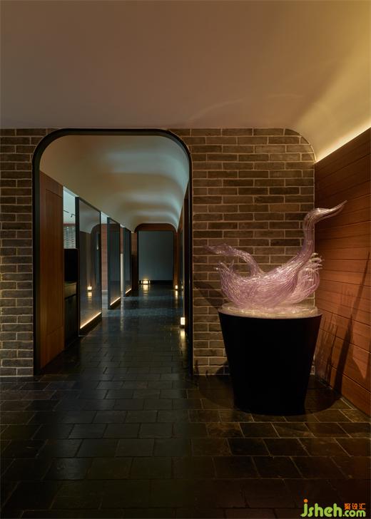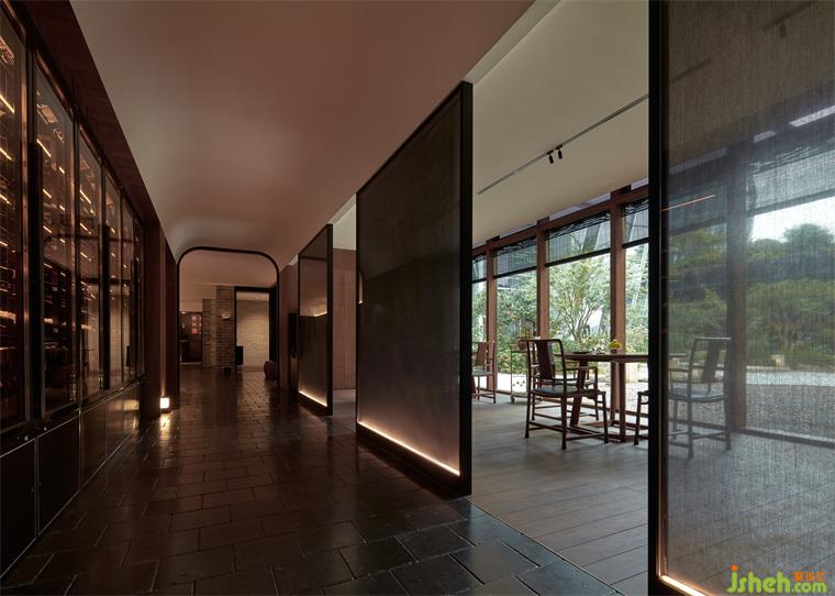 無論東西還是南北,均是由地理屬性的區(qū)別而逐漸流向文化差異,晟永興在上海注定要反復(fù)在“交融”上下功夫。餐廳設(shè)計(jì)將餐廳入口改至東南角后,從大廈進(jìn)入需沿甬道進(jìn)入繞行“晟永興”透光云石屏風(fēng),曲徑通幽再至眼前豁然,空間與自然忽而涌現(xiàn)。