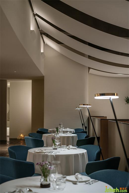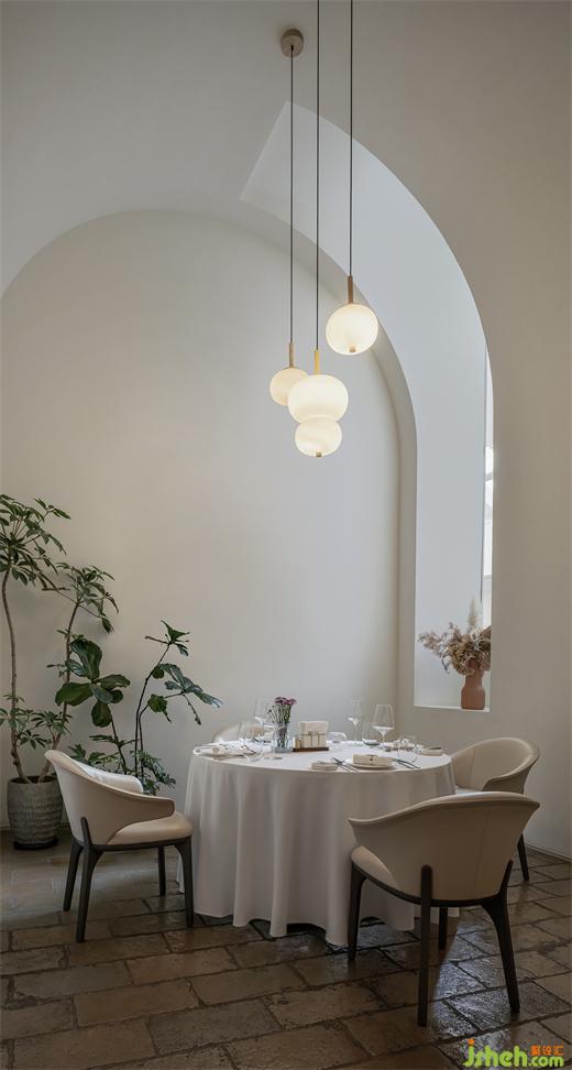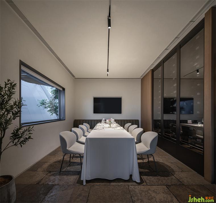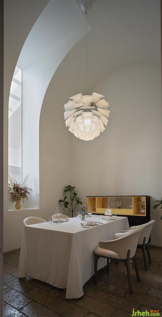 條形窗在內(nèi)部延伸為圓滑拱頂,寧靜是此刻的聽覺體驗(yàn)。瀉入的陽光是教堂圣光,也是普魯斯特筆下雪夜黃昏家中廚房的燈光,更是未經(jīng)雕琢的自然之光。隨折疊門敞開或關(guān)閉,這些區(qū)域在開放封閉間自由切換滿足不同用餐需求。