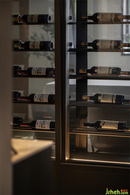 米色編織織物遮蔽天花設(shè)備輕盈垂吊而下,地磚選用了一種西班牙進(jìn)口天然石材,由于整個(gè)空間俯瞰是向窗口收攏的扇形,通過現(xiàn)場(chǎng)調(diào)整磚縫寬窄控制這一細(xì)微的變化。煙粉色玻璃是葡萄酒、玫瑰、陽光、晚霞的顏色,襯漁網(wǎng)狀金屬向內(nèi)打開,人們可以步行至戶外廊道,有如百年前的古堡穿行至現(xiàn)代,抖落了世紀(jì)灰塵,一身清朗。
