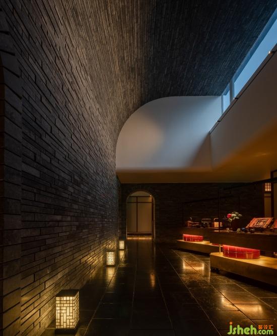 空間是在一個(gè)現(xiàn)代性的簡(jiǎn)潔構(gòu)成下層層豐富遞進(jìn)的,條形灰磚與簡(jiǎn)素的肌理漆在立面鋪陳延展,在垂直方向的天花盡頭彎折隱入天光,高度設(shè)計(jì)和弧面控制減少了對(duì)封閉邊界的感知,而它的意向既是安徽的也是北京的,作為空間敘事的大背景恒定而有力。