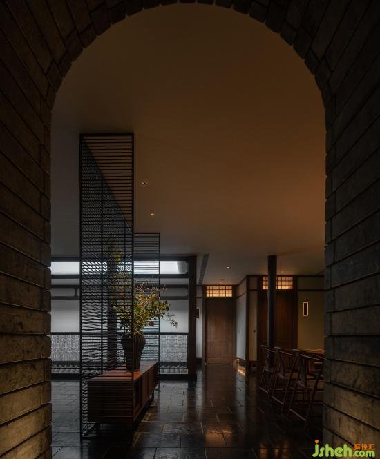 提籃陳列柜提示著一個(gè)不容薄待的大徽州,透過(guò)格柵,茶室在環(huán)游的盡頭靜待來(lái)客。