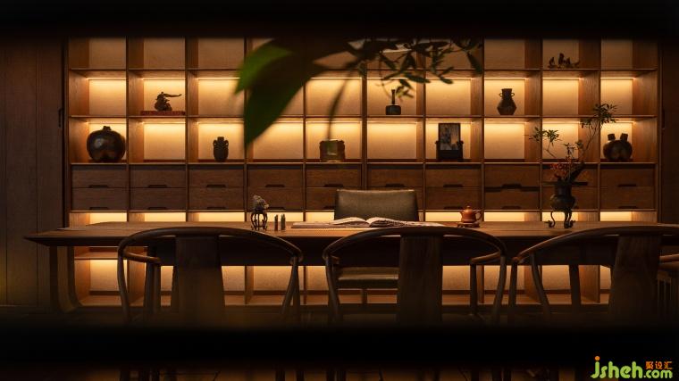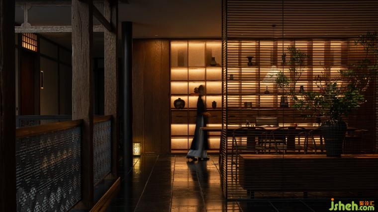 The display shelves, featuring traditional baskets, hint at the grandeur of Huizhou, while through the latticework, the tea room quietly awaits its guests at the end of the journey.