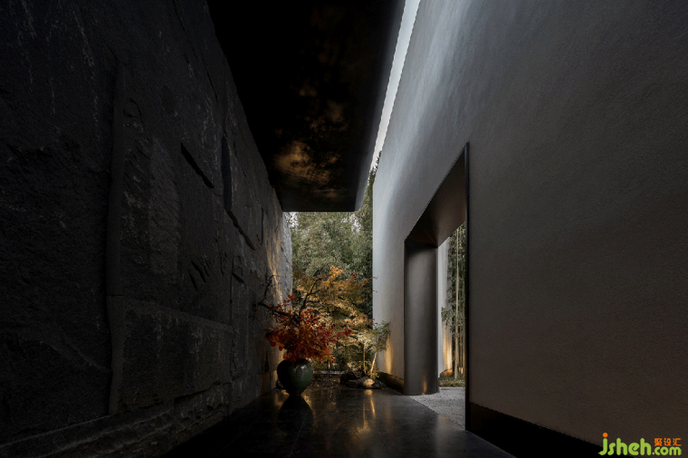 在人的高度和視線范圍內(nèi),內(nèi)和外的分隔被減省,腳下是堅(jiān)實(shí)的大地,一側(cè)是樸茂沉雄如山巒的深色石壁,寬大的出檐形成屋蓋,光或雨的潮汐將由屋漏滴入內(nèi)外間隙。