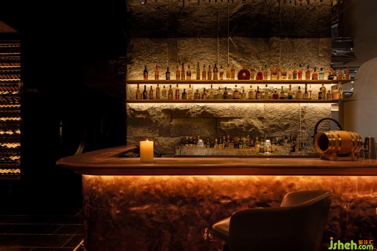 手工敲制的吧臺(tái)使用約386公斤紫銅退火手工鍛打塑形而成,強(qiáng)有力地點(diǎn)燃了進(jìn)入后的公共區(qū)域,這是餐廳劇目驚艷的亮相。墨色石材和鏡面之間,華美謙和的金色四散。