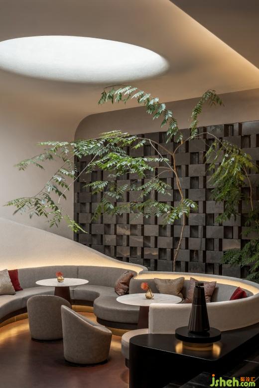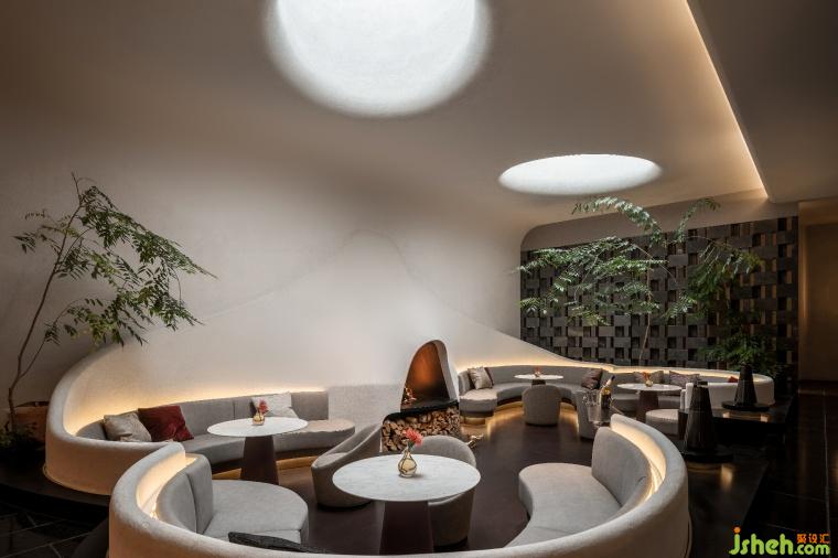臨側(cè)潔凈的下沉區(qū)是一個(gè)柔軟的樂(lè)池,使人想起一個(gè)寂靜的山谷,流暢的弧面勾勒出的卡座有如一片燦爛的云景,聚集在山上的酒神頂禮者從高處俯視它,日月毫不吝嗇潑灑它的光輝,天花的開孔更具神性的哲思。