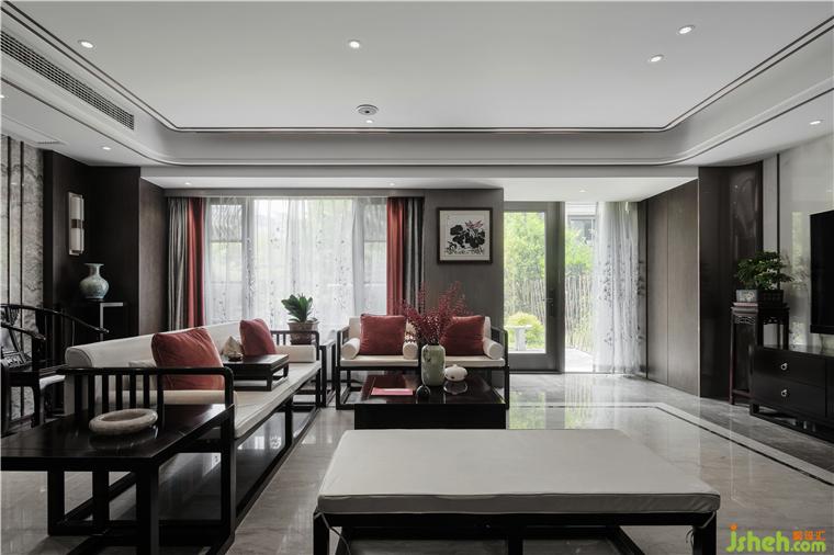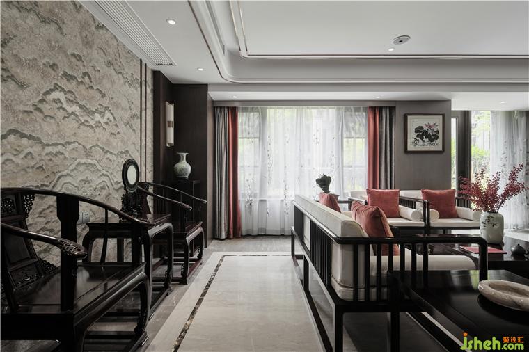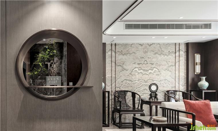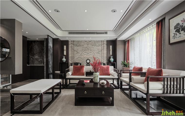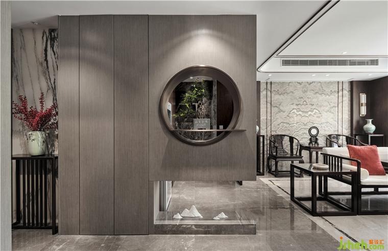 家作為靈魂的棲息之所,表達的是一種立場,也是一種態(tài)度。我們更希望給業(yè)主打造一個安靜淡然、清新素雅的居住空間。新中式風格的魅力在于,延續(xù)古典氣質的同時又將現(xiàn)代元素融入其中。充分考慮空間秩序及功能需求,中式別墅設計將沙發(fā)放置在客廳中央,開放的動線使得視線可以自由穿梭,延展空間維度,讓氛圍自在流動。深淺木飾面、金屬不銹鋼線條、天然大理石、鏤空金屬隔斷、夾絲藝術玻璃等材質的相互結合,搭配簡單素雅的中式家具和朱砂紅色系軟裝,呈現(xiàn)理性雅致的藝術空間。屏風造型的床背景,用灰調梅花和山水刺繡做映襯,塵世繁華間隱匿著寧靜祥和,也為安逸和諧的空間增添了幾分藝術的從容。