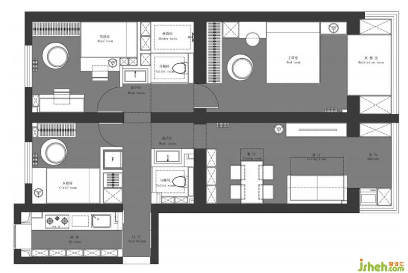 原始布局的男孩房門正對玄關(guān),考慮到成年后孩子的隱私空間和洗手間布局,恒田家設(shè)計師巧妙地利用了部分原來男孩房的空間將其作為淋浴間和洗手間,北京裝修設(shè)計同時將男孩房的房門改為正對陽臺一側(cè),房門打開時可以和陽臺形成室內(nèi)空氣對流,可謂是一舉兩得。