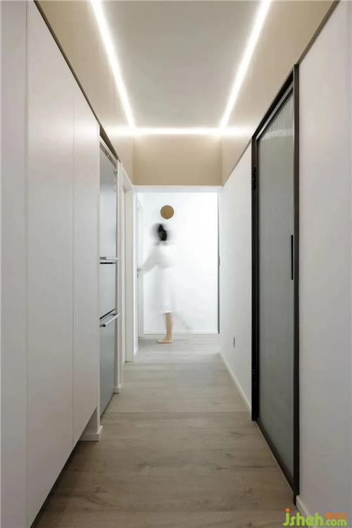 迎面可見的墻上壁燈點綴和屋頂?shù)木€性燈增強視覺引導(dǎo),用材質(zhì)和燈光的對比,讓整個空間層高有了巧妙化解,緩解了原先梁頂所造成的空間壓抑感,進門后的視野也變得更為開闊和有縱深感。