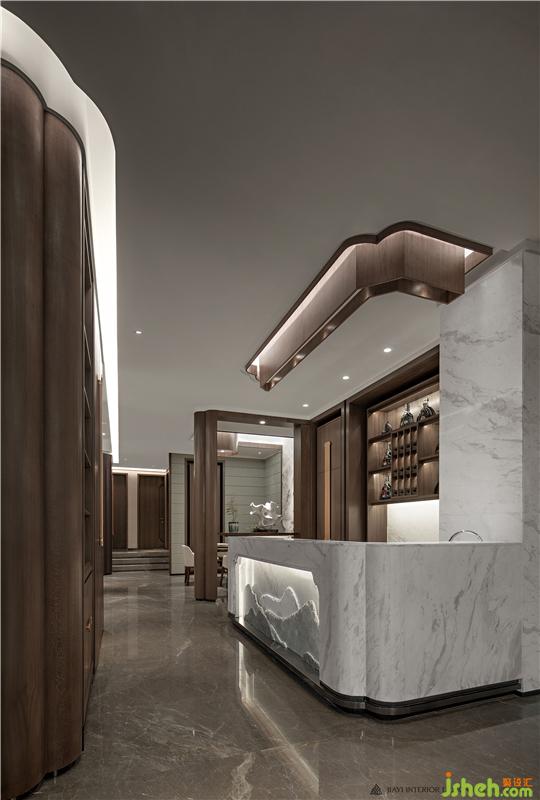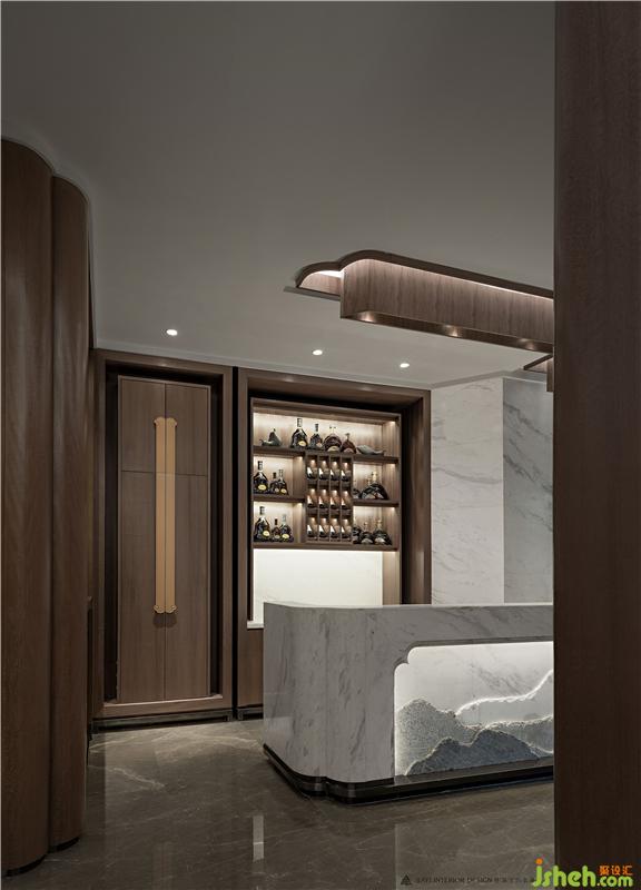 素雅的色調(diào),樸拙的物件,一巨幅山水畫懸掛于廳堂,形成了古色古香的靈妙意趣,木制鏤空的格柵背景在光線闌珊之間制造空間的變化,巧妙的設(shè)計(jì)中帶著對傳統(tǒng)文化精髓的美好追尋。地毯仿若一幅巨大的山水畫為整個(gè)空間的水墨意象定調(diào),與溫潤如玉的家具材質(zhì)相顯益彰,在柔和的光照中營造高雅與平和,為文人雅士帶來清雅怡然、寧靜超凡的空間意境,讓心脈的溝通距離再一次被拉近。會(huì)所設(shè)計(jì)