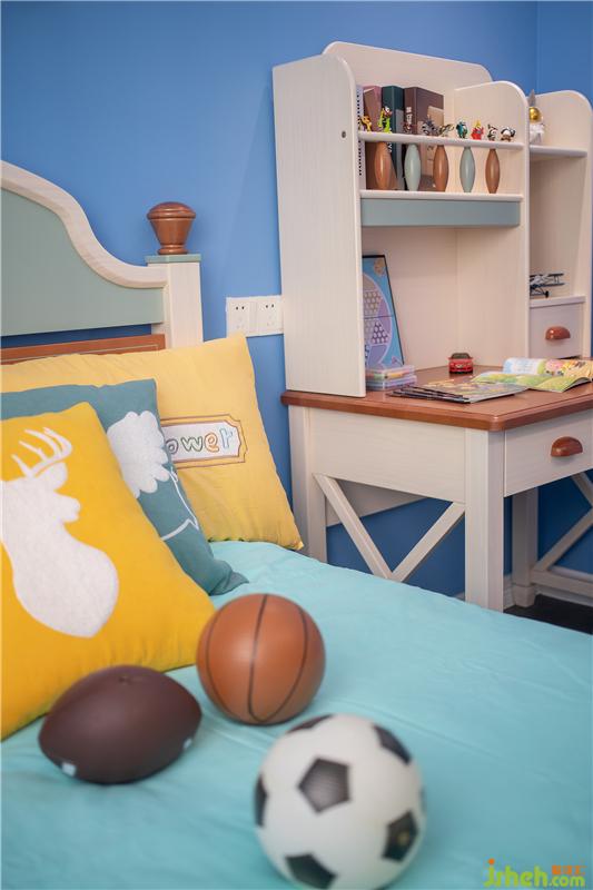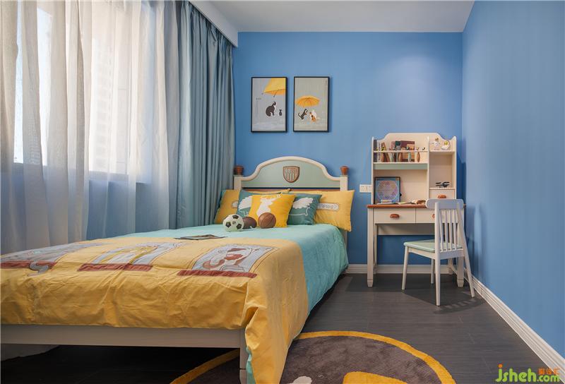 藍(lán)色,與純潔無比的童心最是相襯。室內(nèi)設(shè)計(jì)師以此為空間基調(diào),藍(lán)白呼應(yīng),干脆利落,正是現(xiàn)代白領(lǐng)父母對(duì)體面舒適的極致追求。加之暖黃色的床品、童畫多處點(diǎn)綴,設(shè)計(jì)之余更顯活力,創(chuàng)造出寶貝專屬的成長空間。