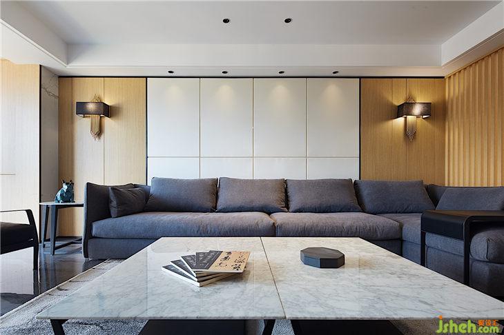 主材名稱:瓦布斯頓巖深灰大板瓷磚,爵士白大理石,淺黃色護墻板,亞麻硬包,木地板,黑色金屬收口件等。