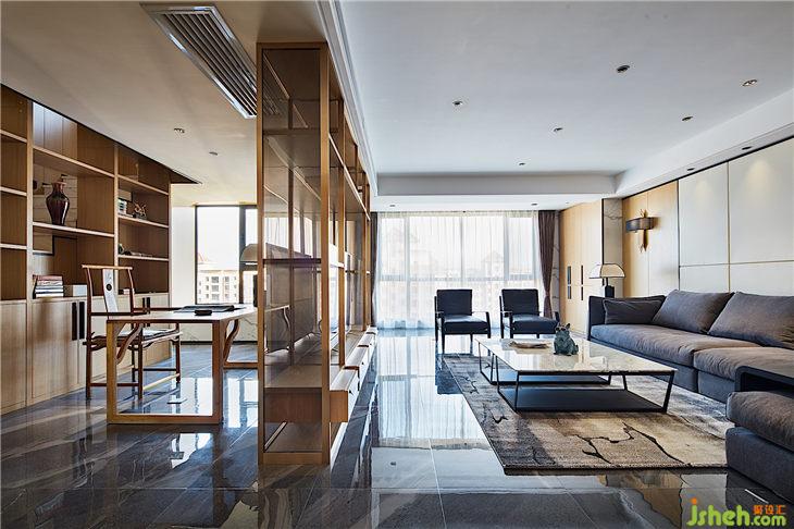 客廳劃分了休息區(qū)和一個小的辦公區(qū),中間選用了一款通透的玻璃展架,既能當電視柜,也是隔斷,不做完全的封閉,加深兩者之間的互動性。