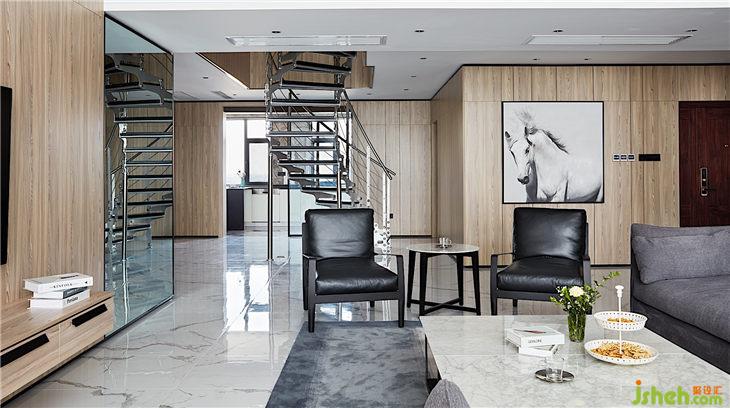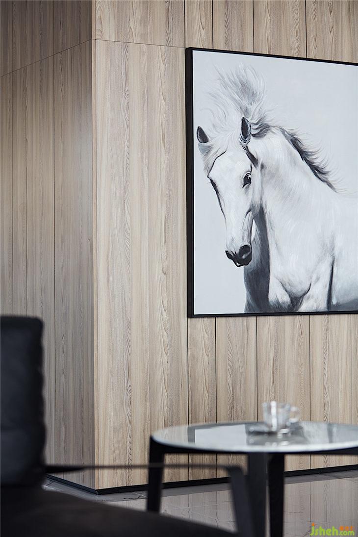 主材名稱:雪花白大板瓷磚,淺灰色護墻板,夾絲藝術(shù)玻璃,灰色木地板,黑色金屬收口件等。