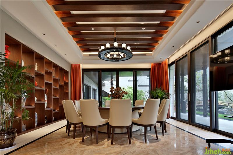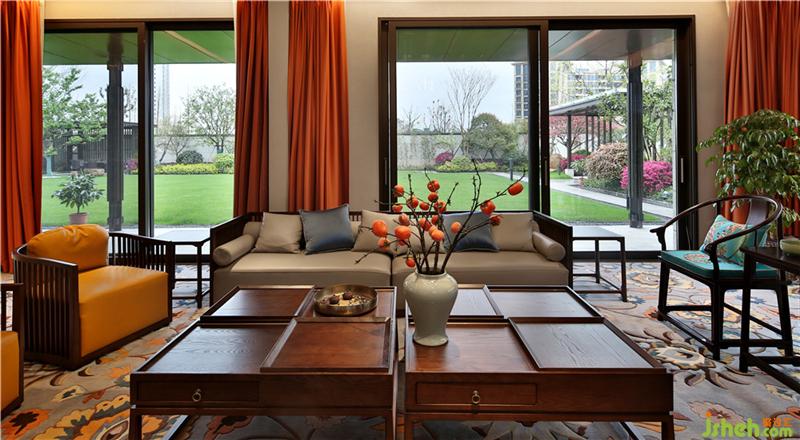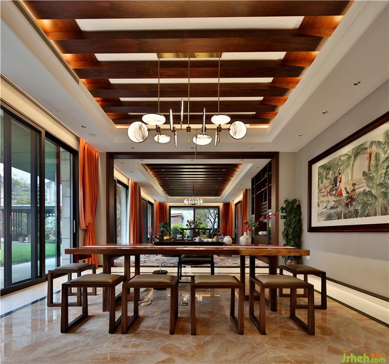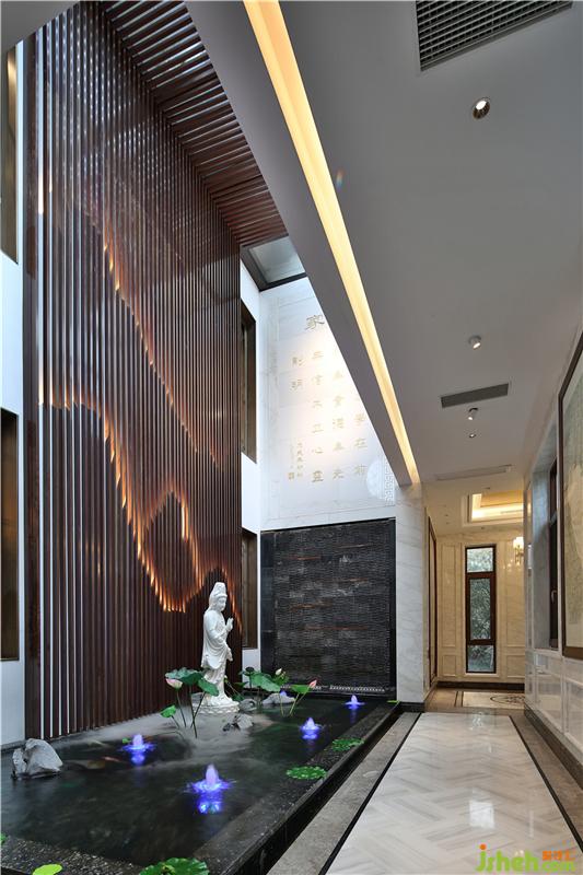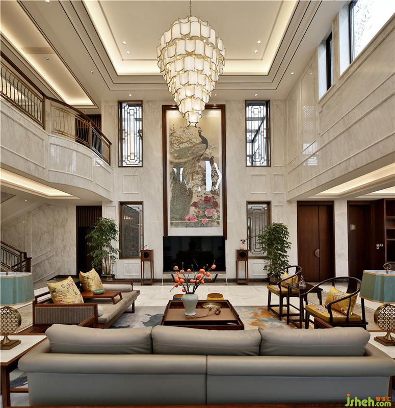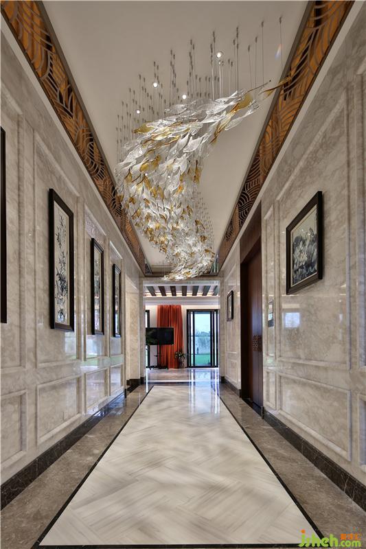 室內(nèi)硬裝方面運用大面積的大理石鋪設(shè)以及軟裝方面中式家具的選擇、國畫的點綴,在空間中顯出別有風(fēng)致的