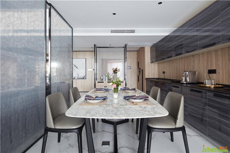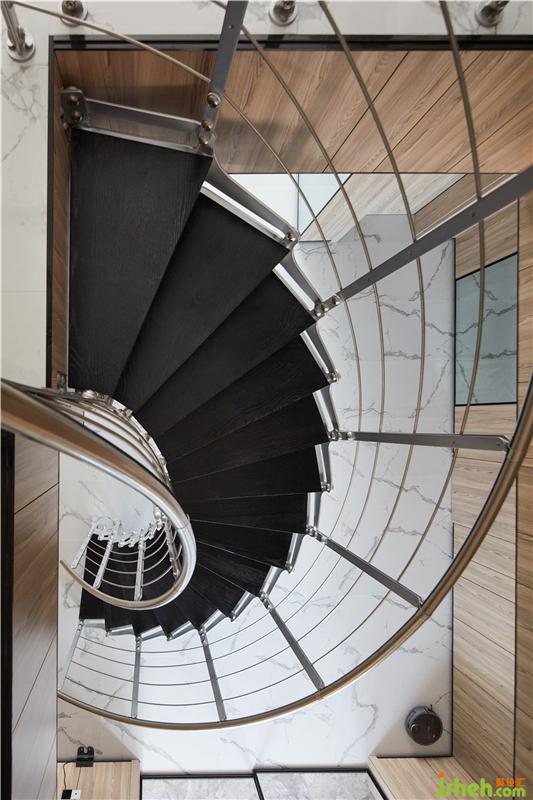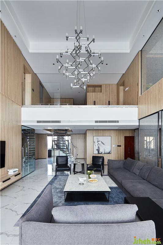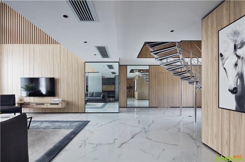 主材名稱:雪花白大板瓷磚,淺灰色護(hù)墻板,夾絲藝術(shù)玻璃,灰色木地板,黑色金屬收口件等。