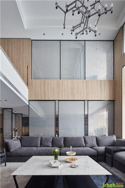客廳的挑高空間,是整個(gè)項(xiàng)目的最大亮點(diǎn),我們希望整個(gè)空間能體現(xiàn)年輕而不失品味的質(zhì)感,所以地面用了大面積的爵士白大板磚,墻面我們則選了淺灰色的成品護(hù)墻板,一樓的餐廳隔斷以及二樓娛樂(lè)室的窗戶,通通用夾絲藝術(shù)玻璃來(lái)裝飾。黑-白-灰,通過(guò)不同材質(zhì)和比例的呈現(xiàn),一直都是經(jīng)典的搭配方案。整個(gè)設(shè)計(jì)中,最吸引的軟裝搭配就是這套寬大的沙發(fā)了。