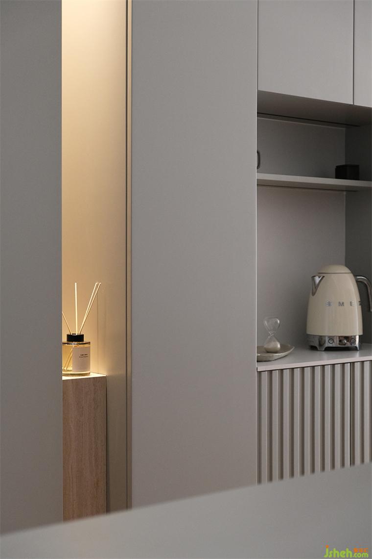 運用消光金屬和溫潤質(zhì)樸的石材,將高級的質(zhì)感揉進溫柔的奶茶色中,蕩起無聲的漣漪,讓極具親和力的空間,顯露出個性。淺淺的暖灰色墻壁拉升了空間的尺度,不同深淺的奶茶色系在地面、墻面和家具上的使用,讓層次更為豐富。