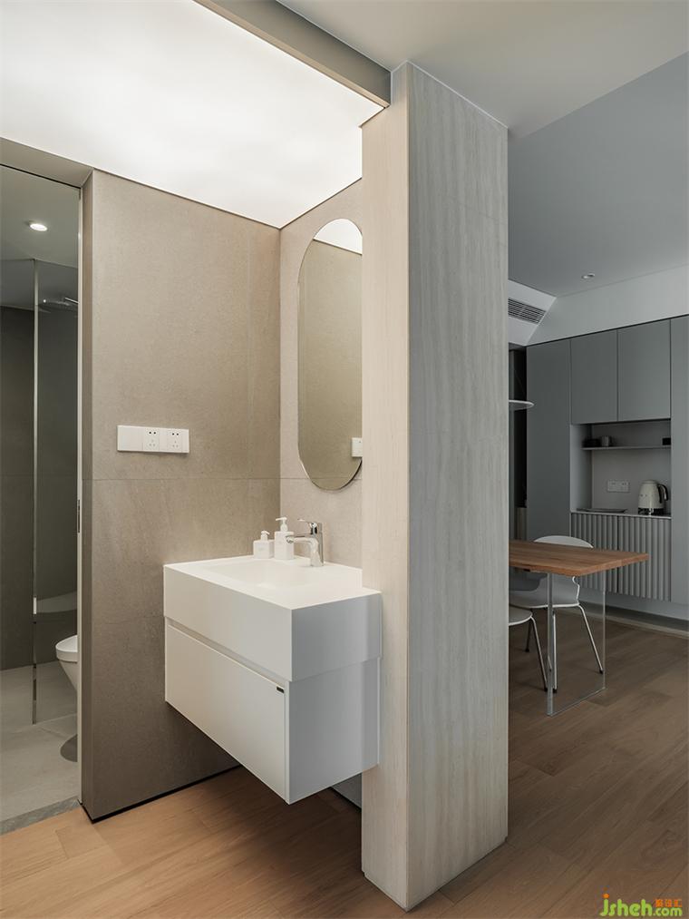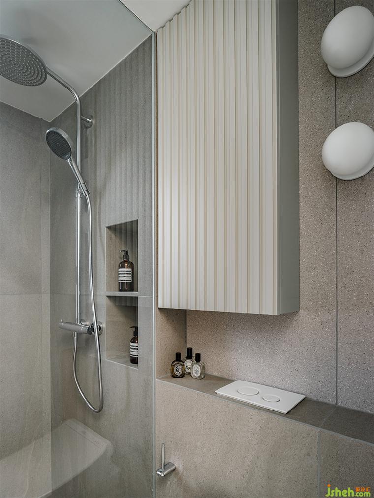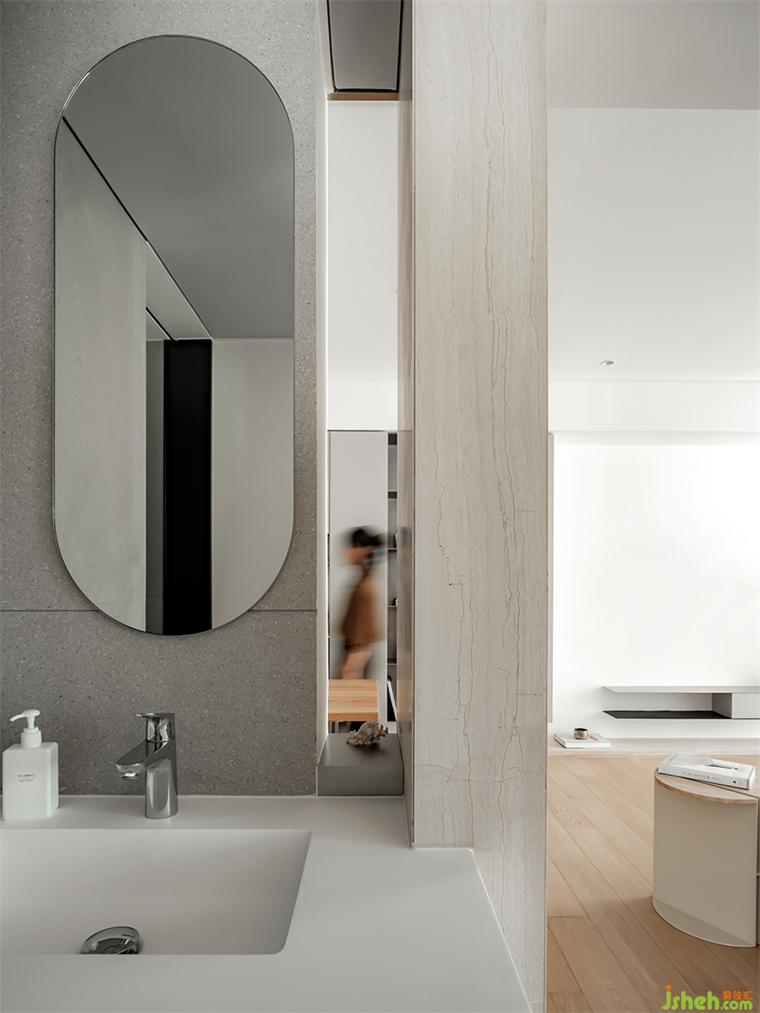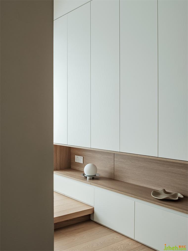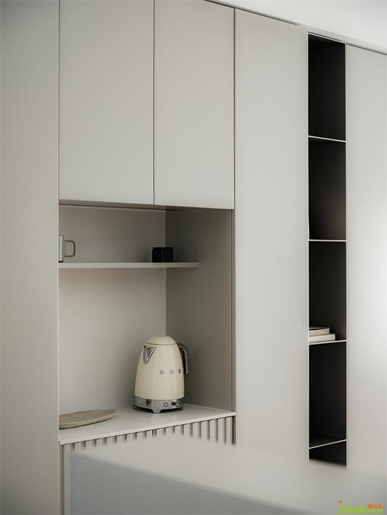 89㎡的空間中,我們設置了連排柜體,實現(xiàn)功能豐富的收納系統(tǒng)。但另一方面,大體量柜體必然帶來視覺上的壓迫感。我們利用開放格形成柜體的分區(qū),類似大自然中河川形成的自然分隔,裝修設計并暗示其功能上的區(qū)分。柜體消除了任何多余的線條,帶來利落的極簡主義美感。