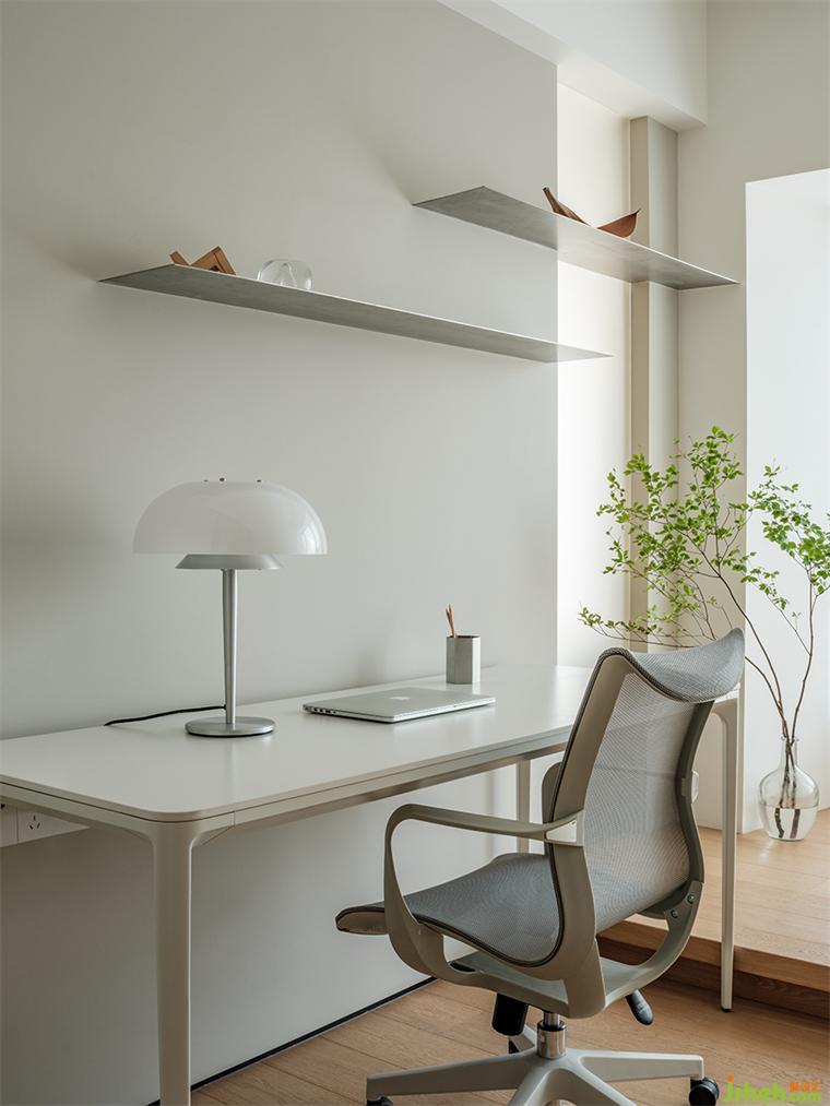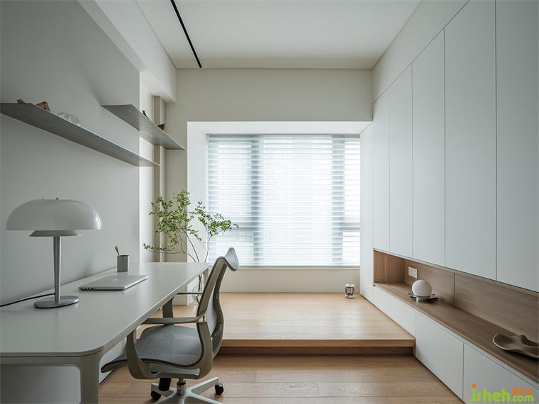 工作室也具備一家人互動的可能,男主人的辦公桌,裝修設計女主人和孩子玩耍的地臺,各安一隅,歲月靜好。訪客來時,關上移門與隔斷簾,鋪好床褥,又是一夜安眠。