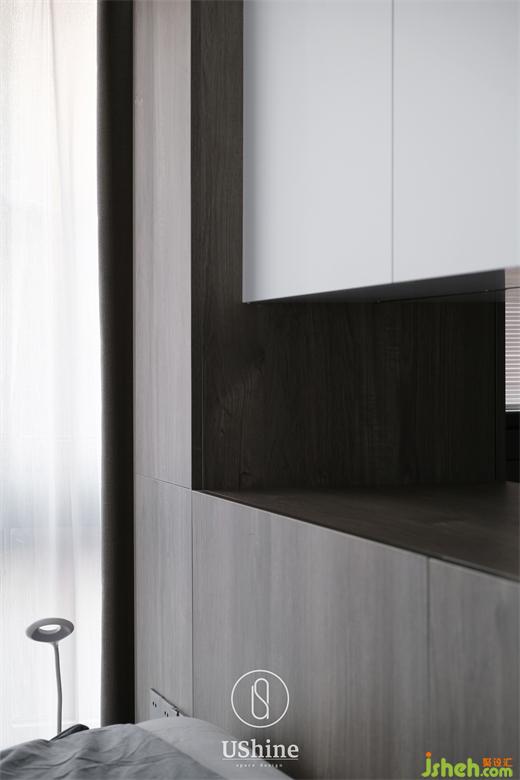 衣帽間延續(xù)同樣的色彩搭配,木色為開放式掛衣置物區(qū),白色抽屜收納細(xì)小物件。一塊層板連接兩邊柜體,貼心地充當(dāng)梳妝臺,以細(xì)節(jié)詮釋行隨機(jī)能。
