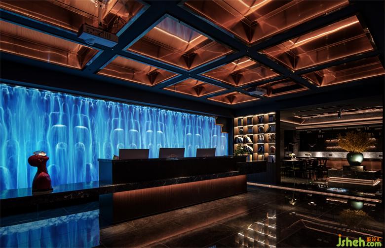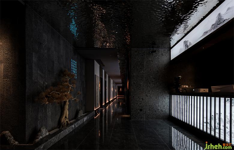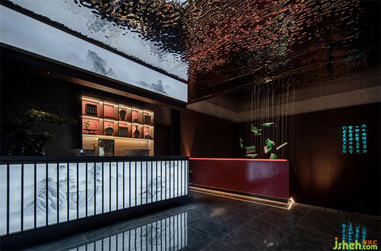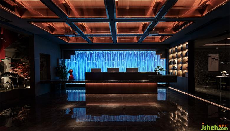 足道設(shè)計(jì)空間入口以退為進(jìn),增強(qiáng)內(nèi)外交互。大堂及前臺(tái)兼顧美學(xué)與功能,以實(shí)現(xiàn)快速為用戶辦理選房及技師安排等為前提。前臺(tái)的背景將贛派建筑代表元素馬頭墻,與全息投影自然融合,利用現(xiàn)代化的手法,打造出符合當(dāng)下城市生活的東方意境。