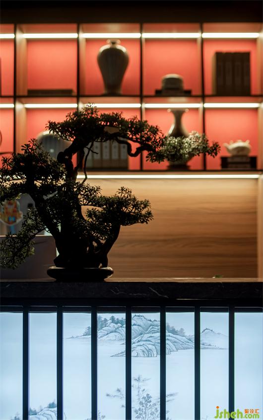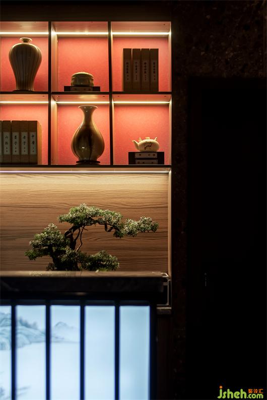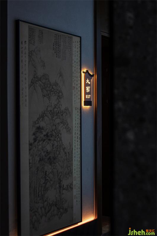 公共過道頂面一體蔓延向前,給人一種通透大氣的感官體驗。墻面上的掛畫及藝術(shù)陳設(shè)透過明暗對比的光線,營造出移步換景、張弛有度的空間體驗。
