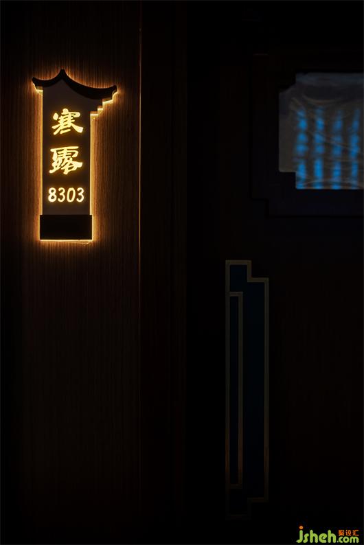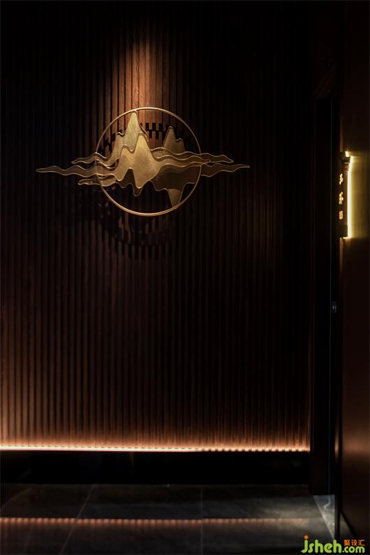 從大堂一側(cè)拾級而上,伴隨著樓梯的旋轉(zhuǎn)幅度,空間情緒得到舒展與釋放。懸于空中翠綠瓷片,光影斑駁間,疊山理水,動靜之間猶如環(huán)繞進(jìn)禾河上的懷抱中。