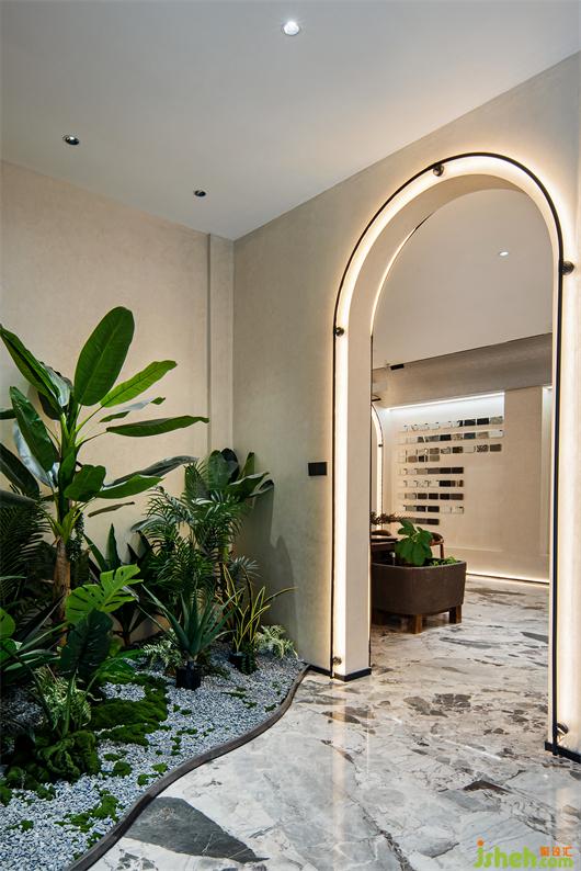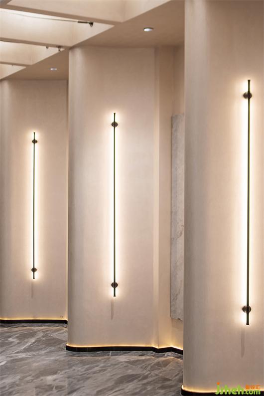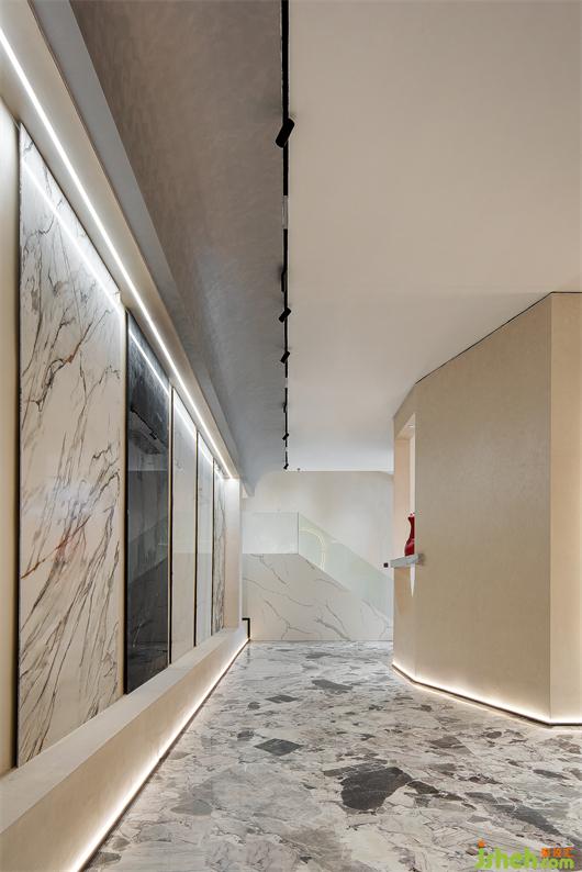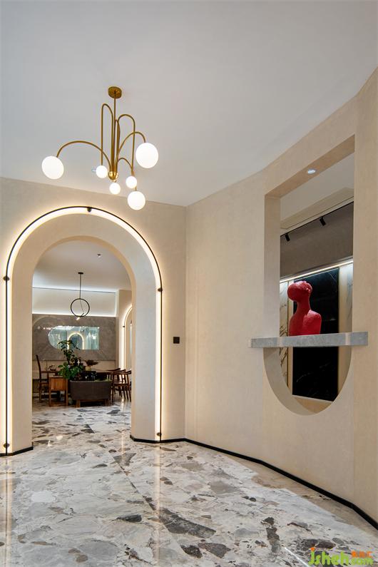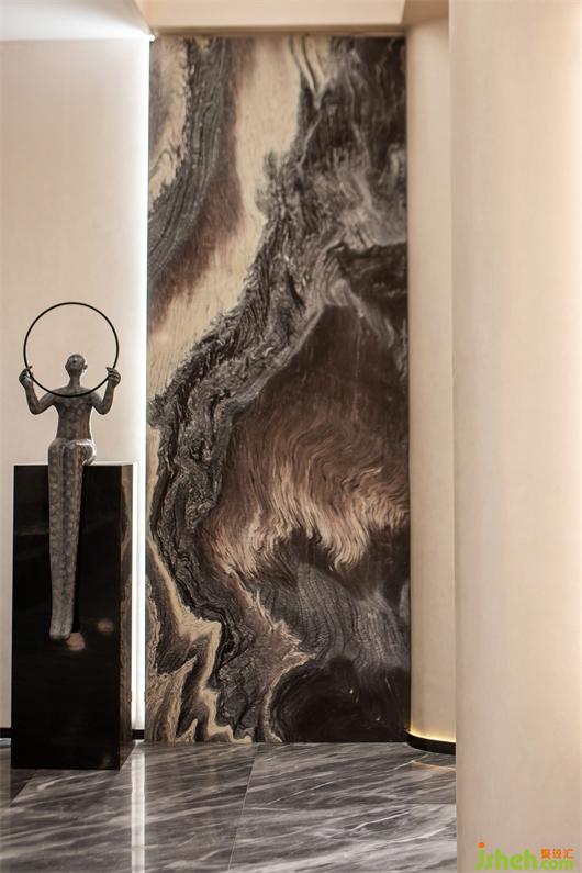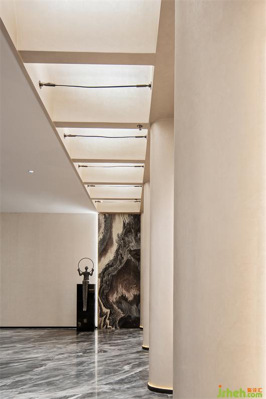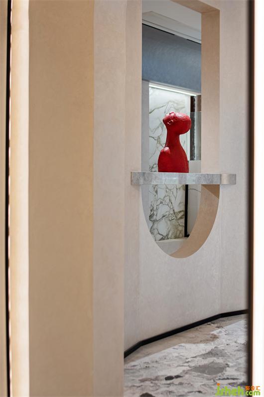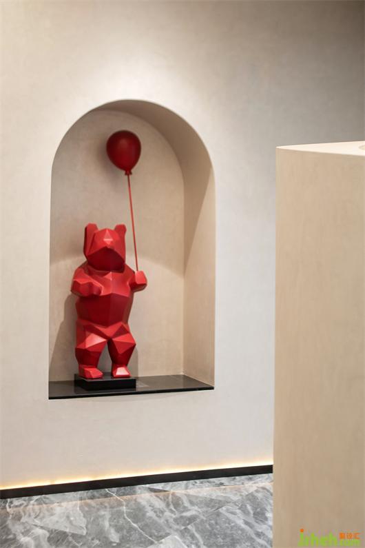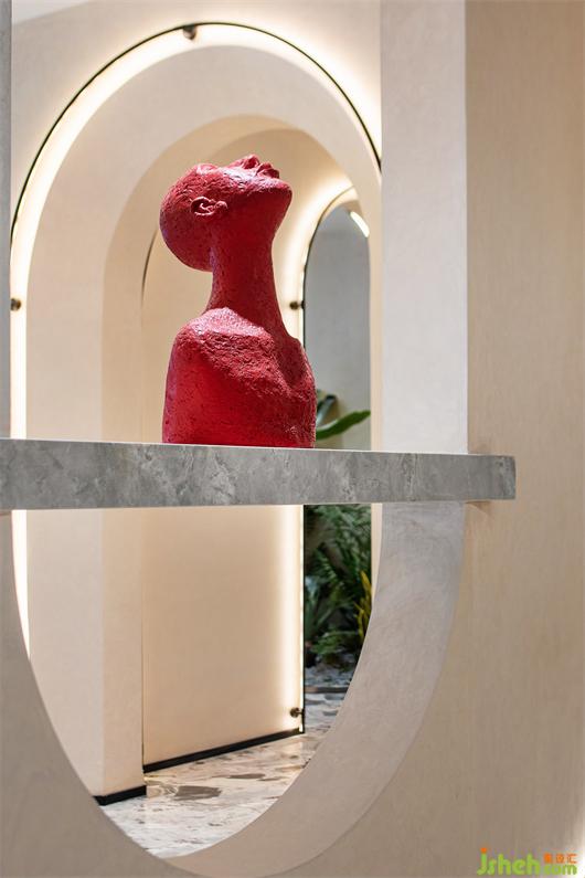 推門而入,入口處墻體被石材包裹著,線條的流動(dòng)性和秩序感豐富了空間層次,呈現(xiàn)出強(qiáng)烈的韻律感。紅色藝術(shù)裝置的運(yùn)用,柔和了石材的剛硬,也予以視覺醒目感。