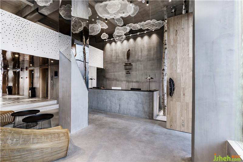 我們通過材料和造型的運(yùn)用,在空間中營造出了天空、海洋、森林、湖泊等場景。酒店前廳放置的白樺樹和網(wǎng)狀云朵吊飾描繪了一個(gè)森林仙境;油蠟皮包裹的前臺(tái)以及七彩毛線裝飾的窗口,在極簡的空間里起到提升空間品質(zhì)的作用;通往客房的通道鋪設(shè)了漸變色彩的地毯猶如沙灘海洋;天花和墻面布置了鋁板雕刻led燈宛若浩瀚星空和宇宙塵埃。在每一間客房內(nèi)我們都放置了一顆橡樹,讓自然的力量在空間里散發(fā)生長。
