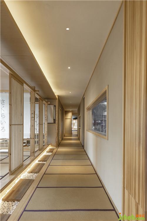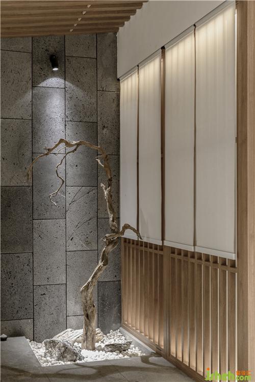 走廊上枯山水的沙石造景,增加了餐廳設(shè)計(jì)場(chǎng)景的庭院感,讓人不禁產(chǎn)生日式庭院的想象空間。