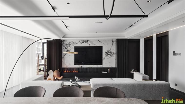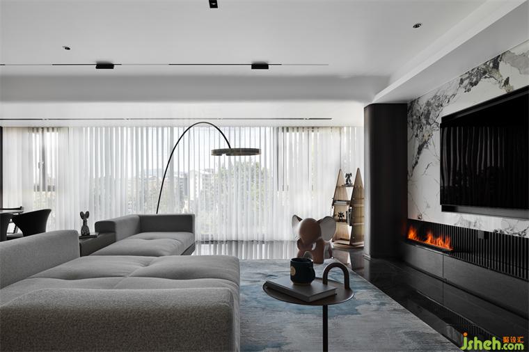電視背景墻:下懸空中間留出電視凹槽,一路衍生至陽臺(tái)區(qū)域,采用墻板弧面倒圓過渡,視覺上隱形突出的梁體。