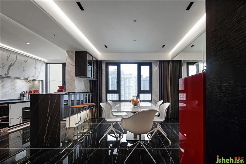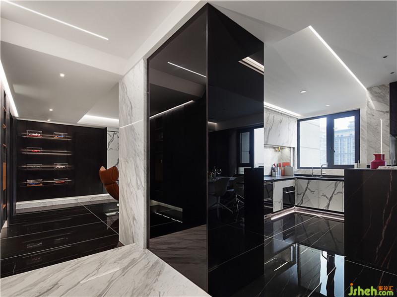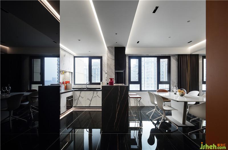 從餐廳進(jìn)入客廳要跨過(guò)爵士白的地臺(tái),這一塊小小的白色把餐客廳空間區(qū)分了開(kāi)來(lái),高低落差的設(shè)計(jì)讓空間更有層次,更有儀式感。不僅打破了這一片黑色的沉寂,讓走道的空間在視覺(jué)上被縮短,并且與客廳中的地臺(tái)遙相呼應(yīng)。