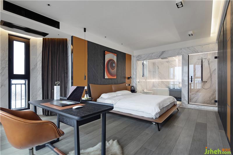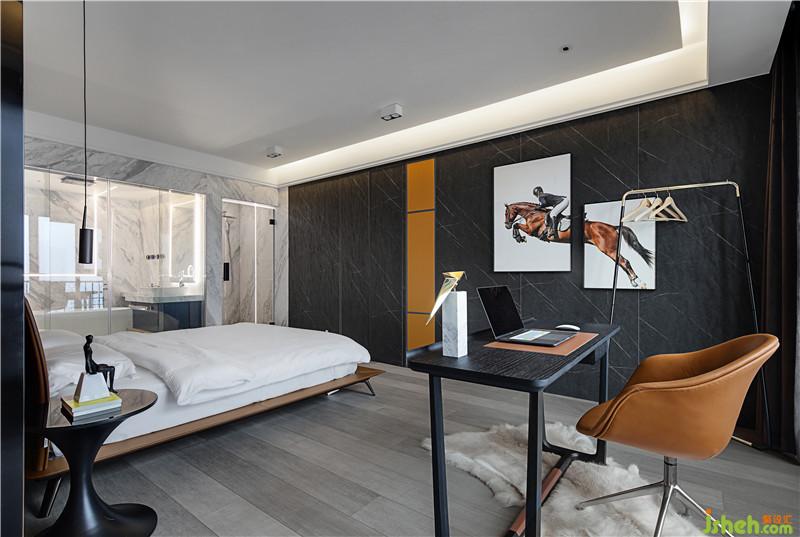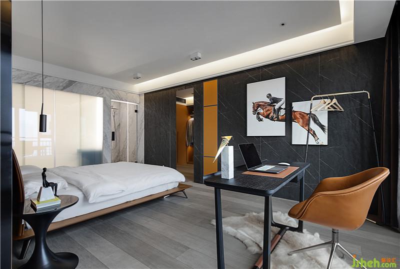 “馬”的元素不止一次地出現(xiàn),因?yàn)轳R給我積極向上的態(tài)度,激勵(lì)著我不畏艱險(xiǎn),奮勇向前。墻面上的橙色柜門板也起到了裝飾點(diǎn)綴和呼應(yīng)床背景中心的作用。