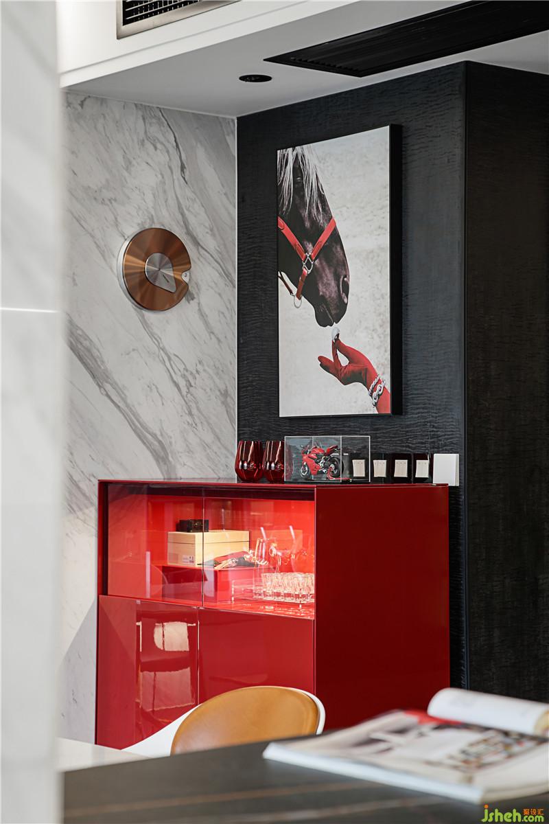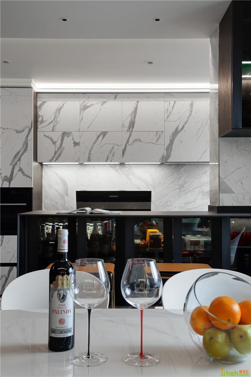 地面選用了900x1800cm的黑色大板,映襯白色的Boconcept餐桌椅和白色大理石墻面。黑與白的藝術(shù)從來(lái)不會(huì)落伍。