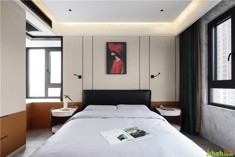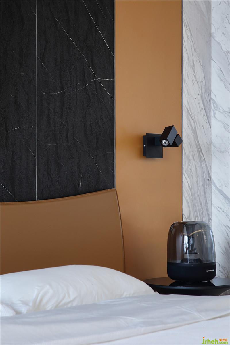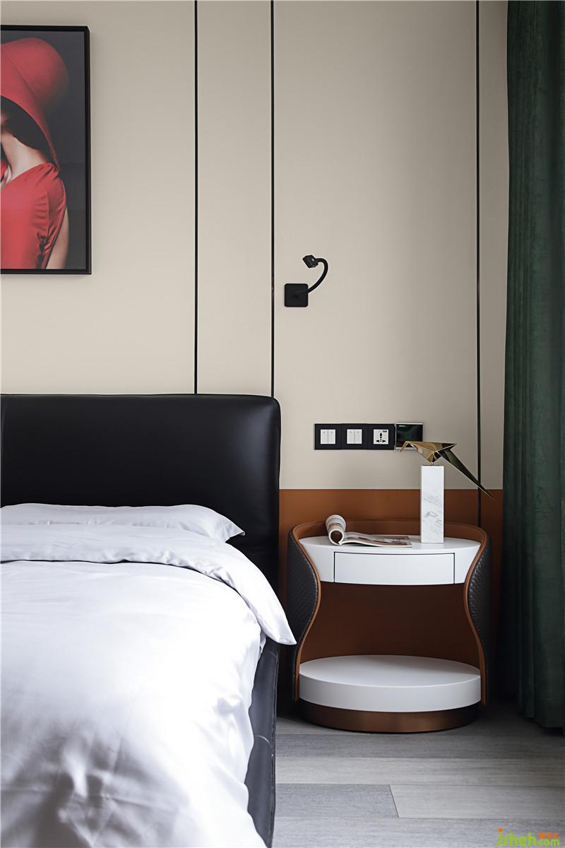 床頭可任意調(diào)節(jié)的閱讀燈是非常實用的。Ricci的黑色皮床與Concise Home的床頭柜在這個空間里,就像是天生一對。裝修公司