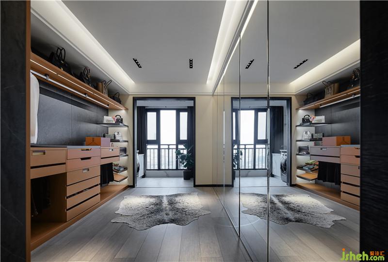 空調(diào)出風(fēng)口也是刻意定制的黑色,和整個硬裝基調(diào)非常協(xié)調(diào),增加了細節(jié)。衣帽間同樣也是采用隱形門的設(shè)計。