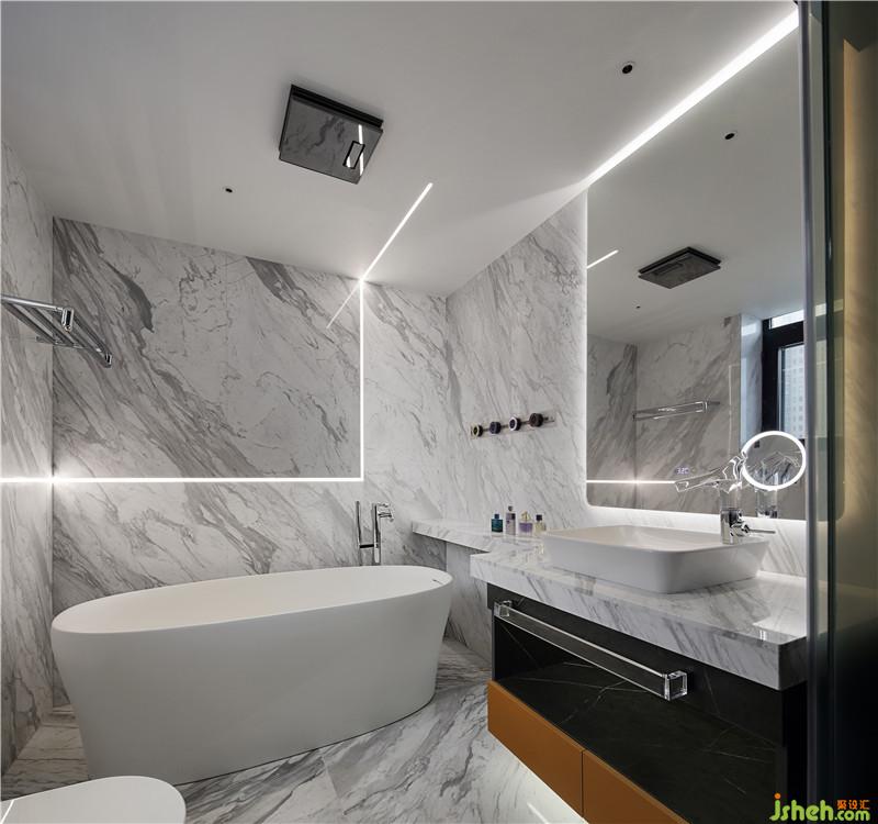 內(nèi)衛(wèi)是全爵士白大理石,配合墻面、頂面貫穿的線形燈,簡單之中彰顯不俗。AXOR的全透明龍頭和Kartell By Laufen的透明毛巾桿,雖然透明,卻成了最吸引人眼球的地方,讓人無法忽略其存在。