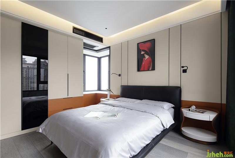 衣帽間的柜子是無側(cè)板支撐的掛墻系統(tǒng),雖然和傳統(tǒng)衣柜只是一塊側(cè)板的差別,但是給人帶來的驚艷感是很強的。黑與橙的搭配與之前黑白,白橙的搭配形成了色彩的遞進。