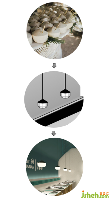 從“椰殼”走進椰子里,又見一片蔚藍的海灘風(fēng)光??臻g里,大到門頭和隔斷,小到屏風(fēng)和燈籠,都是品牌元素潛移默化的滲入和應(yīng)用。餐廳設(shè)計