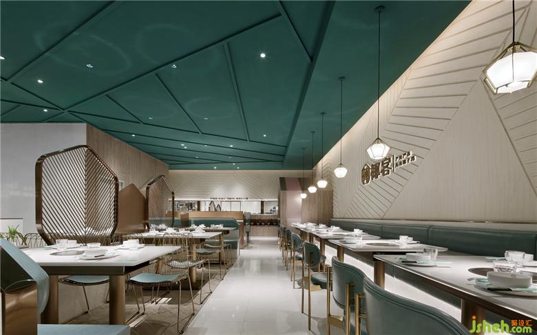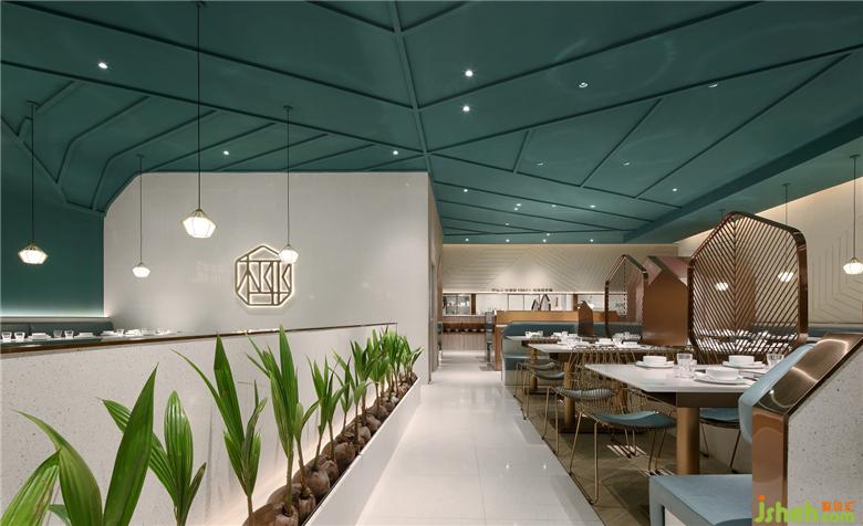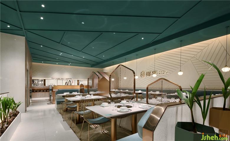 以海灘為基礎(chǔ)色調(diào),以深藍和淺藍的海洋為空間輔助色,還提煉出椰樹葉子的線條元素,營造出清新自然、舒適休閑、時尚輕奢的聚餐氛圍。餐廳設(shè)計